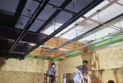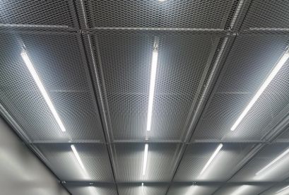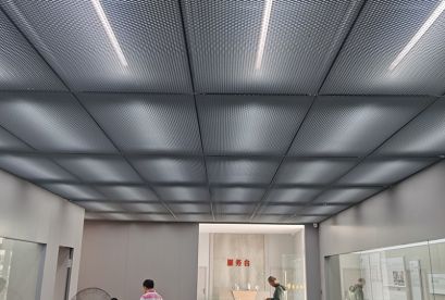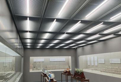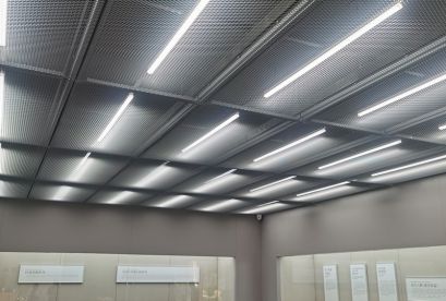 سقف قاعة المعرض مصنوع من شبكة ألومنيوم موسعة ذات فتحات على شكل ماسي ومطلية بمسحوق رمادي فضي. مصابيح LED مدمجة، يمكن توزيع الضوء بالتساوي على المعروضات من خلال الفتحة. بيئة قاعة المعرض بأكملها هادئة ومليئة بالتاريخ.